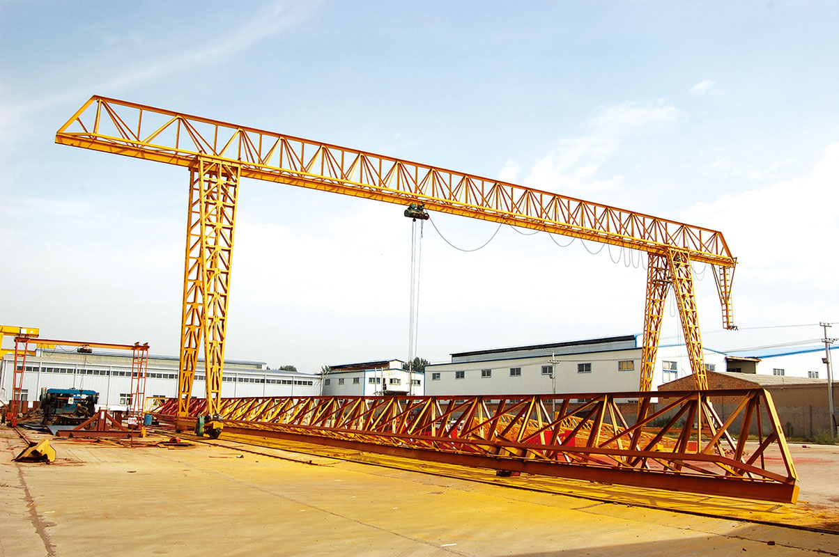 它的金屬結(jié)構(gòu)像門(mén)形框架,承載主梁下安裝兩條支腳,可以直接在地面的軌道上行走,主梁兩端可以具有外伸懸臂梁。